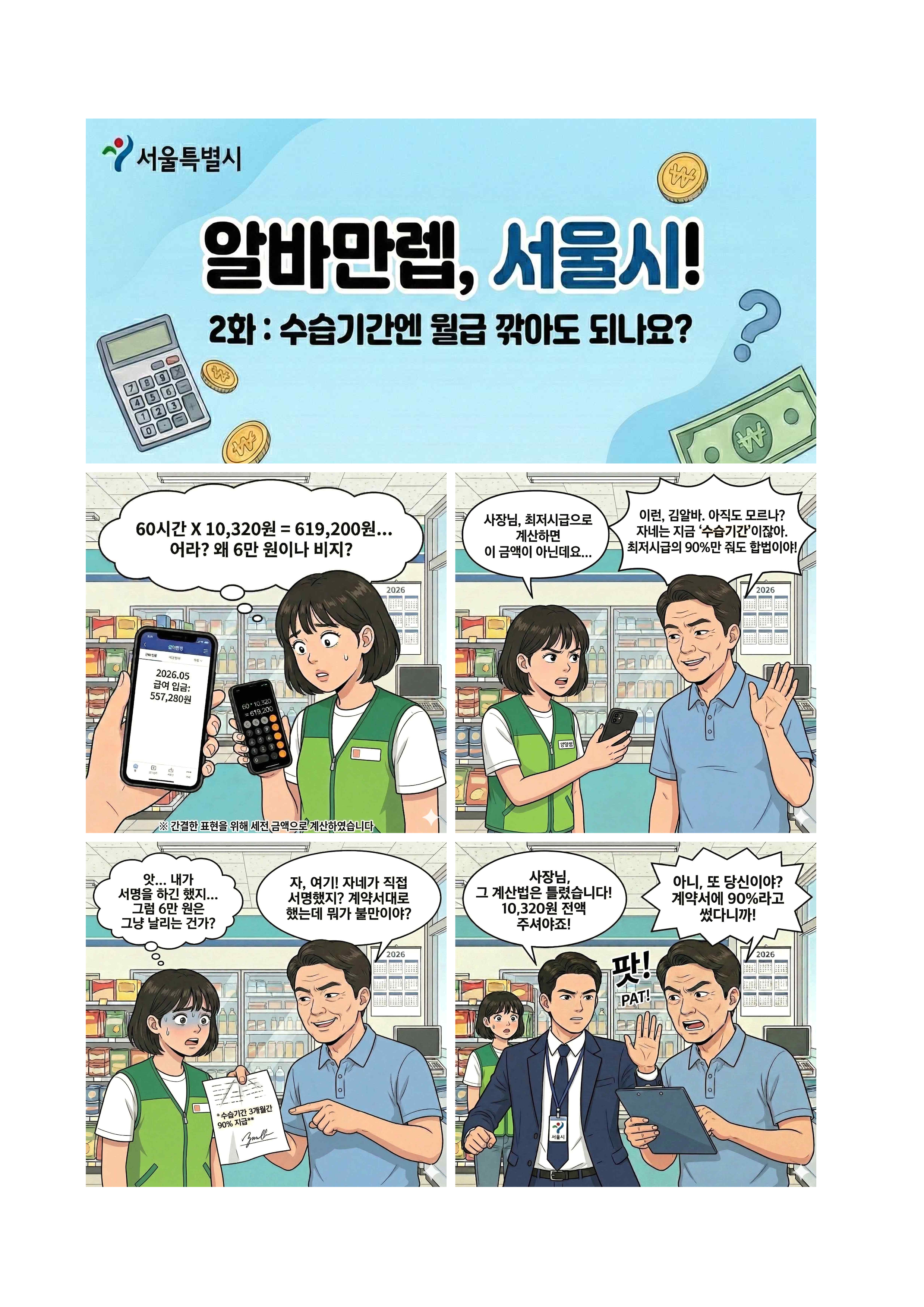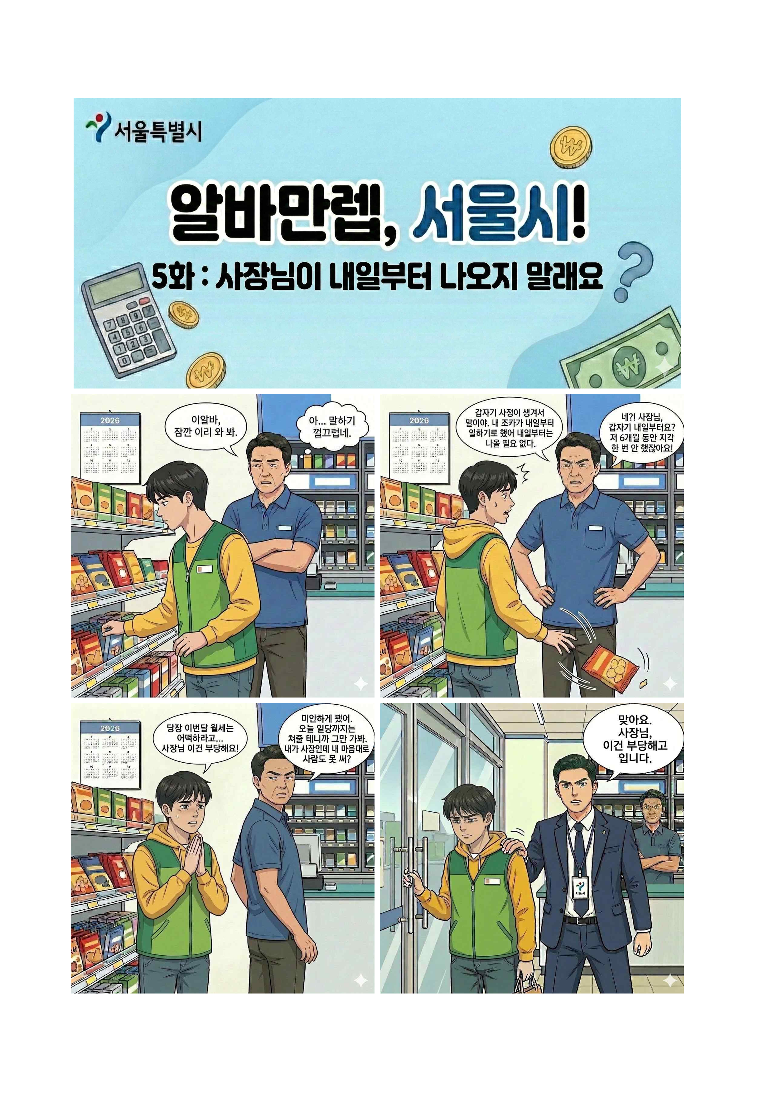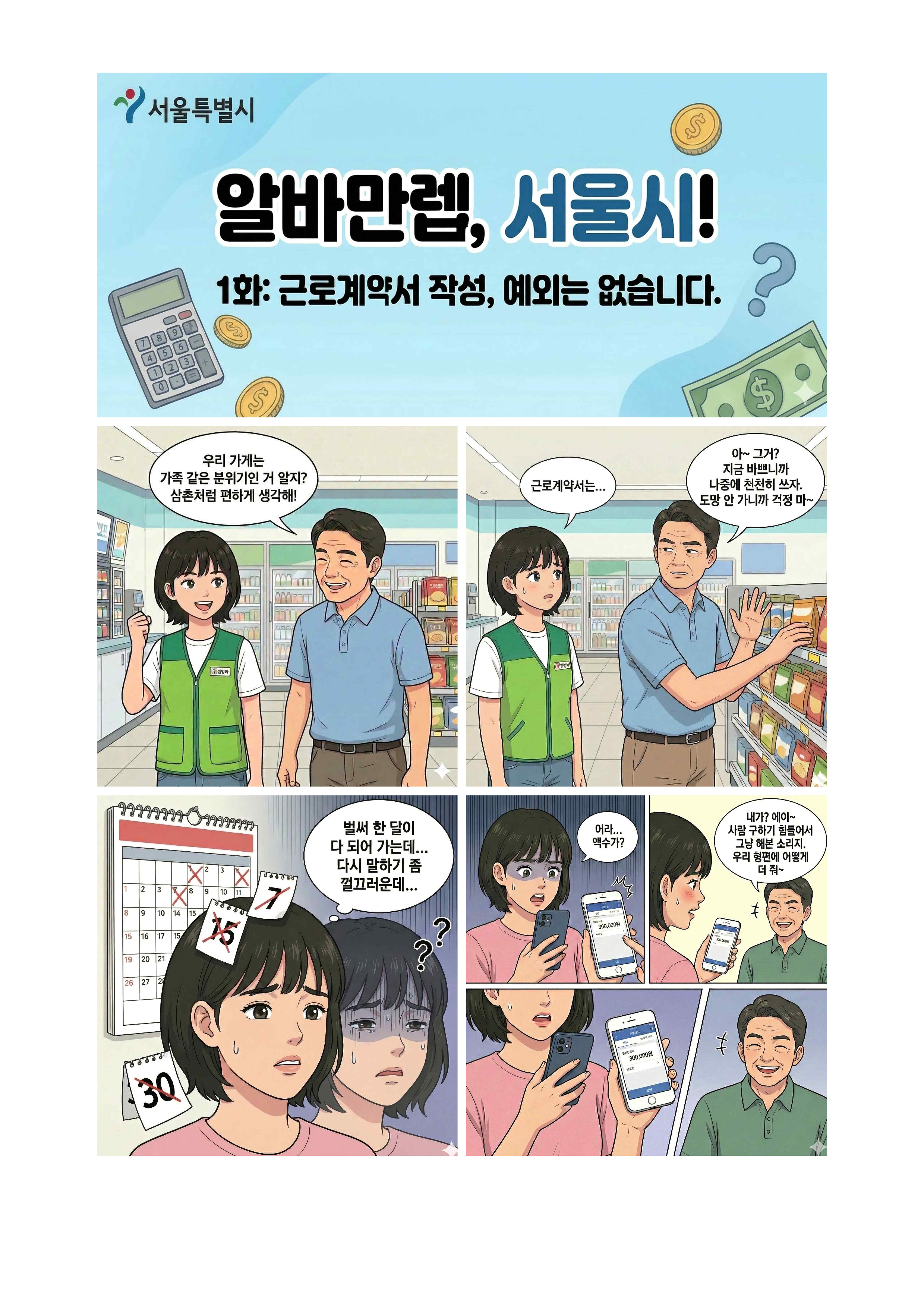 처음 시작하는 아르바이트, 설레기도 하지만 “계약서는 어떻게 쓰지?”, “이거 부당해고 아닌가?” 고민될 때 많으셨죠? 여러분의 소중한 노동 권익을 지키기 위해 서울시가 야심 차게 준비한 웹툰 <알바만렙 서울시>시리즈를 공개합니다!