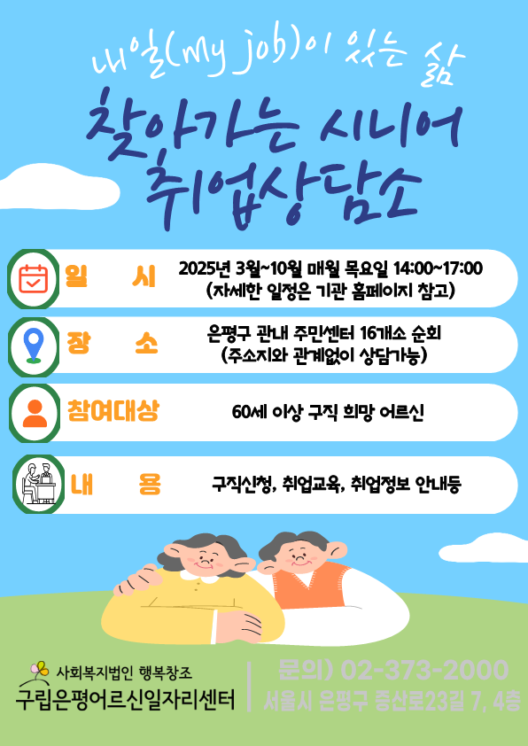 📣📣 은평어르신일자리센터를 이용하지 못하는 주민들이 편리하게 일자리 정보를 접하고 취업에 성공할 수 있도록 ‘찾아가는 시니어 취업상담소’ 운영을 시작합니다.