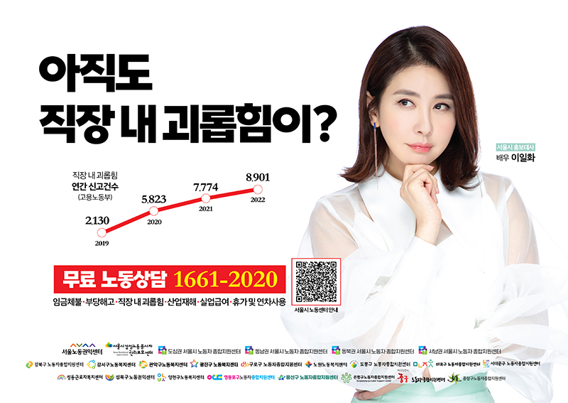 이번 직장 내 괴롭힘 지하철 광고에는 서울시 홍보대사인 배우 이일화님께서 함께 해주셨습니다.