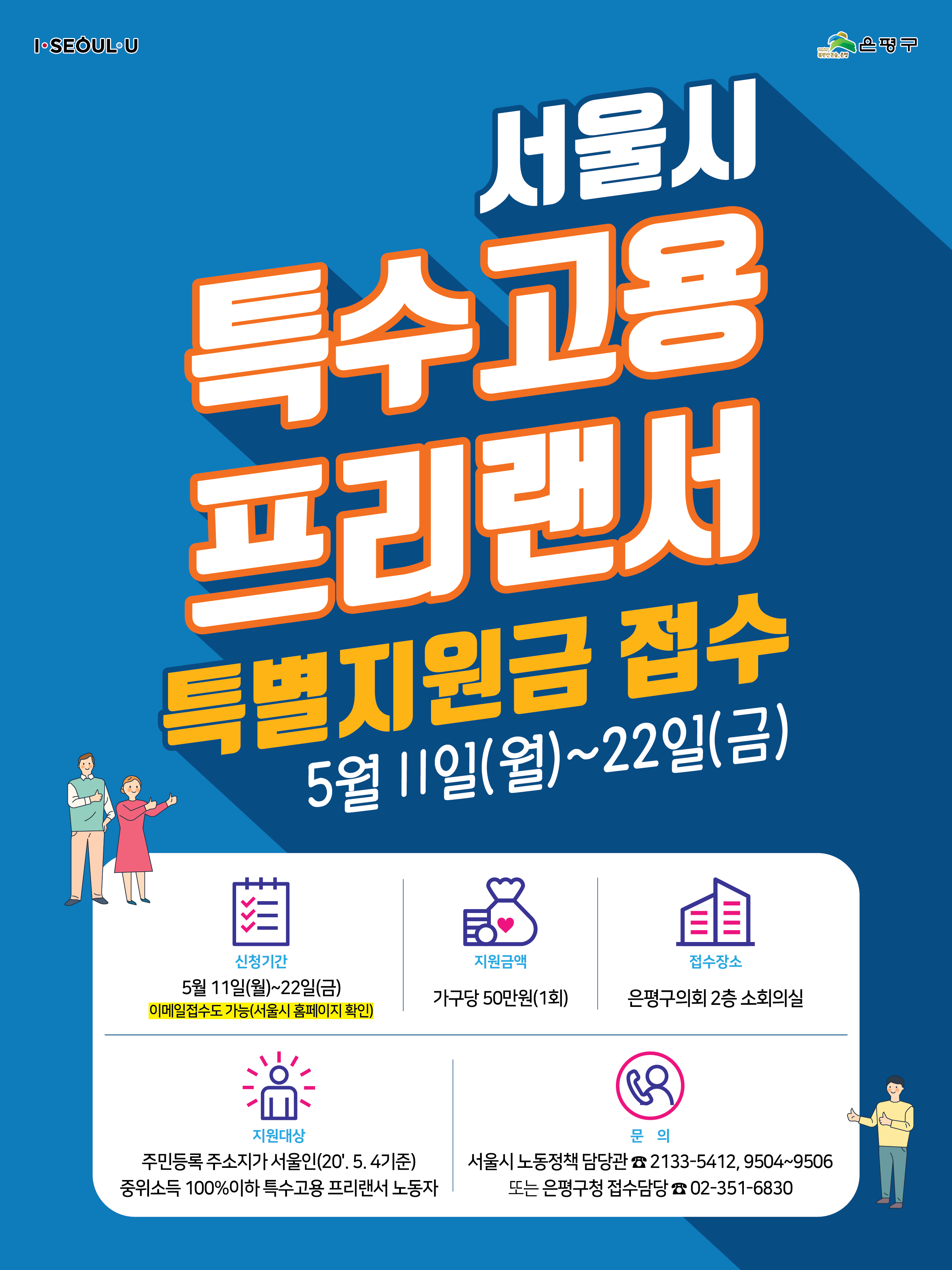 서울시에서는 코로나19로 인해 휴업·휴관 등으로 생계 위기에 직면하고, 사회보험 사각지대에 놓여있는 특수고용·프리랜서에게 특별지원비를 지원하고 있습니다.