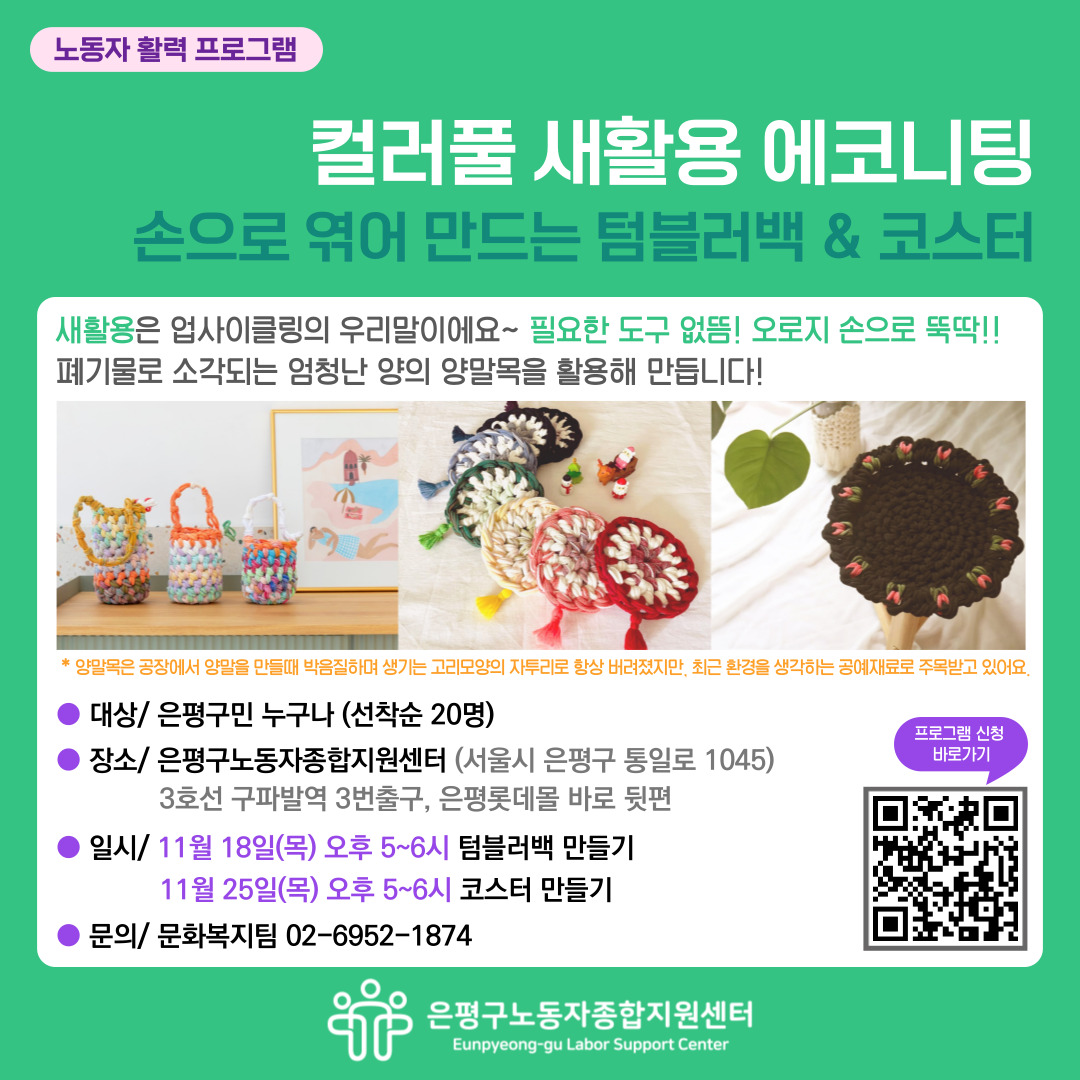 안녕하세요! 은평구노동자종합지원센터입니다.노동자 활력 프로그램 「컬러풀 새활용 에코니팅」 참여자를 모집합니다 : )