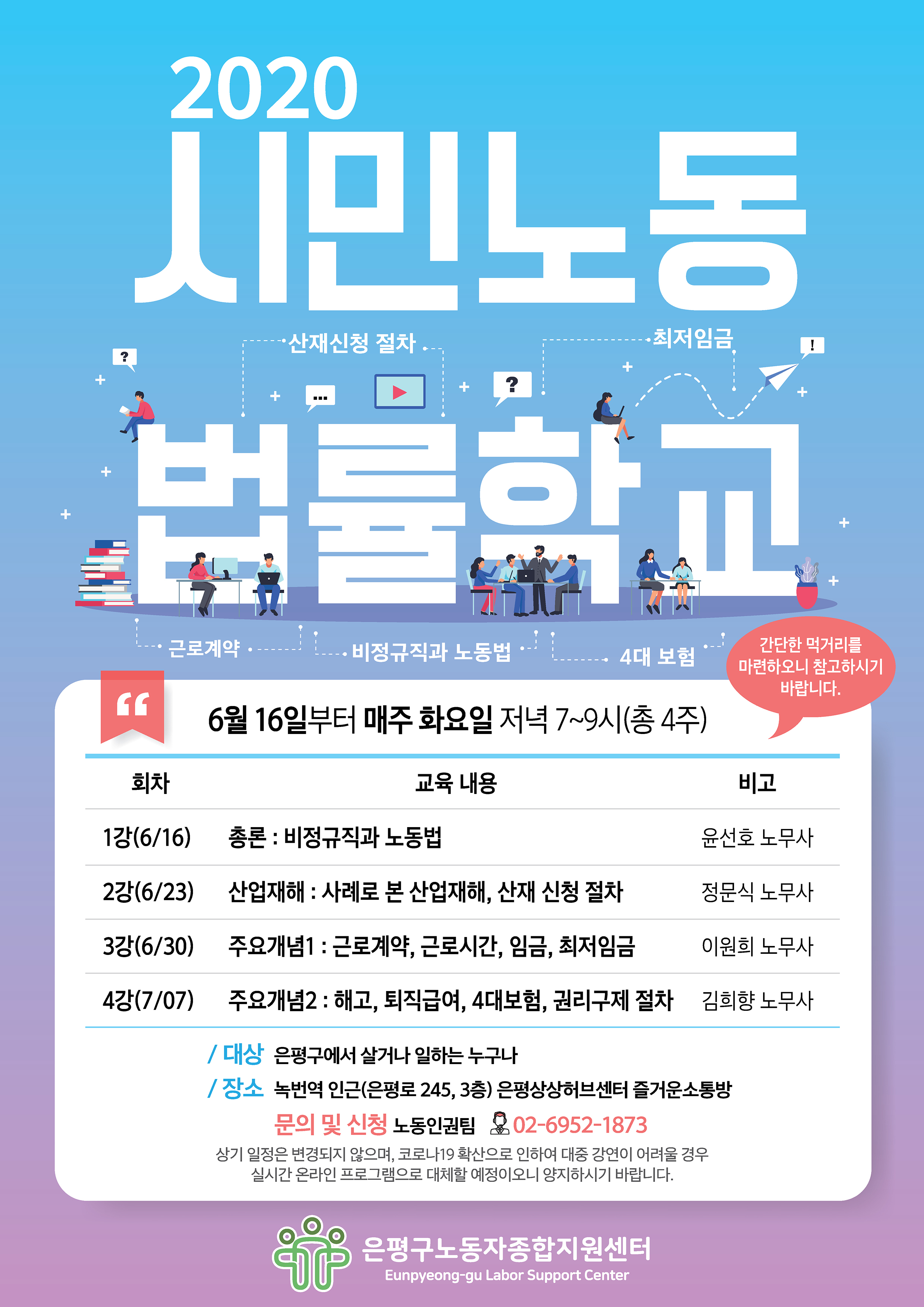 중앙재난안전대책본부 ‘강화된 생활 속 거리두기 시행’(2020.5.28)의 공공시설 운영중단 조치 및 ‘수도권 지역 대상, 강화된 방역조치 연장’(2020. 6.12) 조치에 따라, 은평구노동자종합지원센터의 시민노동법률학교를 6월 23일부터 매주 화요일 오후 7~9시 온라인(유투브 실시간스트리밍)으로 진행합니다.