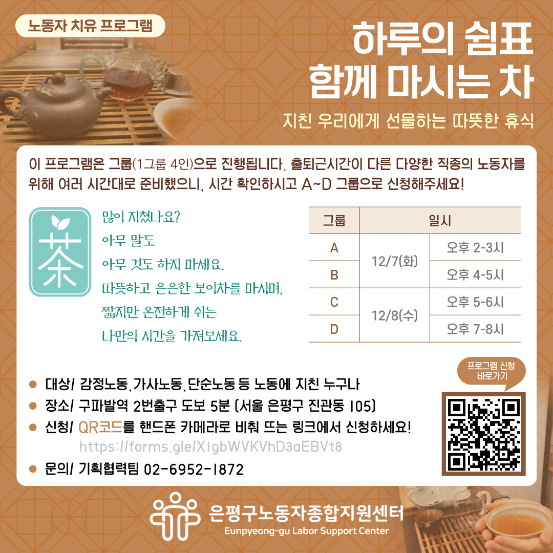 안녕하세요! 은평구노동자종합지원센터입니다.노동자 치유 프로그램 「하루의 쉼표, 함께 마시는 」 참여자를 모집합니다 : )