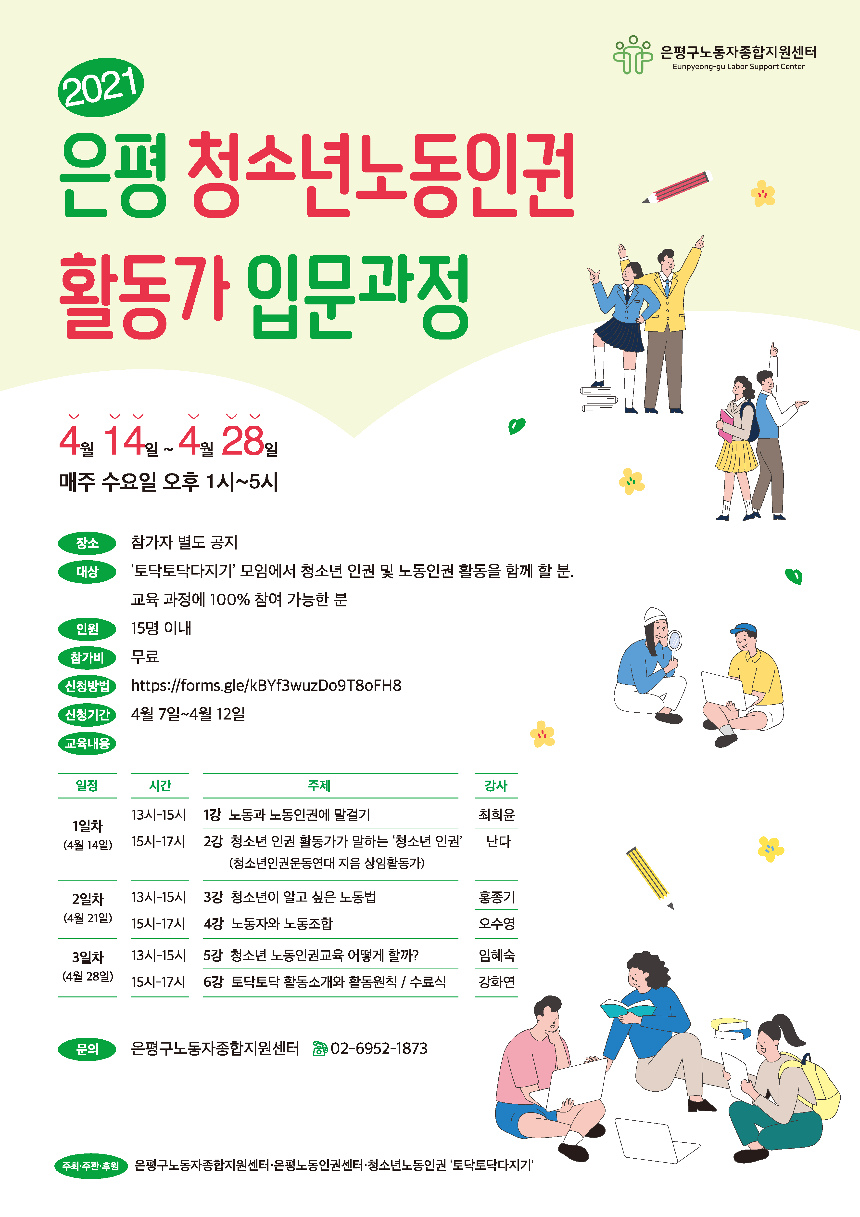 2021 은평 청소년노동인권 활동가 입문과정 참여자를 아래와 같이 모집합니다.